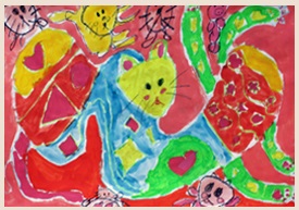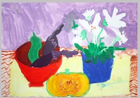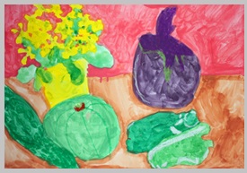 結局、9月から、土曜日クラスを開講することになり、なぜか、すっぱり、金曜日は女の子、土曜日は男の子に別れました。で、そろそろ、じっくり一つの課題に取り組んでいくことにもチャレンジ。『たくさんの色を使う』というテーマで、賑やかな色の花瓶をまず自分で好きに書いて、さらにそこに隙間なく豪華な花を入れてもらうという、通常ならあり得ないような極彩色の絵ができました。いつも使う色は結構限られてくるので。ここは絵の具が濁らないようにしながら、たくさんの色を経験。これからも自分の好きな色だけじゃなくて、いろいろな色の組み合わせをしてみてね。 |
