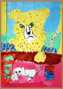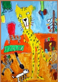 10月!麗しき10月!素晴らしい10月。芸術の秋ですよー。こども達も元気です。アトリエも色々挑戦いたしました。低学年、つまり、1年生、2年生も、先生の「こうしよう」とか「こうしたらいいよ」とかの言葉にも反応してくれてます。うん?今までは野放しだったの?いえいえ、じっと座っていられるのは立派です。勝手にお絵描きしてるわけじゃないので、先生の声もよく聞いてね。で、2回に分けた動物の絵。まず、背景をローラー版画で色々工夫して草原のイメージで仕上げ、次の週は、いっぱい資料を探して好きな動物を描きました。おー、ユニークな動物達、おー、資料いらんかった?年に1度はじっくり動物の絵を描きますが、毎年、感心することしきりです。 |
