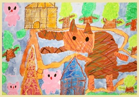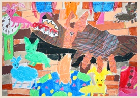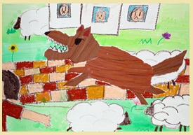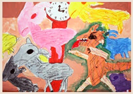 子どもたちがまだもっと小さかった時、「ねぇねぇなんか描いて」といわれて、ハタと困ったことがある筈。何か描こうと思っても何も思いつかなくて、ついドラエ……。子どもたちも同じで、さらに経験値が少ないのですから、「何描いてもいいよー」といわれると、コマルナ、コマルナ。しかし、お話の絵を描くとなると俄然ワクワクします。今回はオオカミが主役のお話を思いだして、描きました。オオカミだけ、自分で作った色紙で貼ったので、ユニークなオオカミ続出。しかし、あの赤い舌を描くと、オオカミらしくなるねー。 |