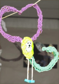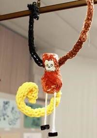 | 5月になると、それぞれ新学年の落ち着きが出て、制作を見ても、学年が上がったなと感心することがよくあります。アトリエでは、スクラッチや、ステンシルなど、水彩絵の具だけではない技法を取り入れて描いてみました。工作は鉄棒人形。発泡スチロールを熱線カッターで切る時は真剣そのものでしたが、意外と難しかったのは、割り箸にゴムをギュッと巻く作業。ゴムを巻く、紐を結ぶ、等、日常生活にありそうな作業がなかなか、機会がないようです。しかし、クルクル回る出来上がりはいつまでも見ていられる動きでしたね。 |