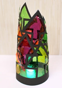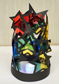 | 12月になると、先生もクリスマス工作が楽しみです。今年は黒い紙を同じ幅で切って組み合わせました。例えば四角い紙をコの字を切って、また内側の残りからコの字を切る、感じ。やはり三角から切り出すと、ツリーのイメージに近づきます。裏にセロファンを貼ってステンドグラス風ライトカバーと名付けましたが、「先生、これ、何に使うのん?」と、シビアな声も。中に入れたLEDライトがちょっと暗かったね。持ち上げて、ガラス窓に貼ると綺麗でしたょ。 |