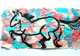 | アトリエでは、ちょこちょこ絵本の読み聞かせをしてから、「お話しの絵」を描きます。こんなの高学年、大丈夫かなと思いきや、結構な盛り上がり。で、『きょうりゅううんどうかい』。落ちてくる卵を受け止めるシーン有り、綱引きの綱が切れるシーン有り、鼻先で写真判定になるシーン有り、貼り絵にしたのが良かったのか、かなり臨場感のある絵になりました。高学年女子の頭の中は、絵本の世界も、彼氏とのメールも、友達とのおしゃべりも、同じ世界のようです。 |