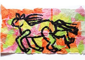 | アトリエでは、ちょこちょこ絵本の読み聞かせをしてから、「お話しの絵」を描きます。こんなの高学年、大丈夫かなと思いきや、結構な盛り上がり。で、『きょうりゅううんどうかい』。落ちてくる卵を受け止めるシーン有り、綱引きの綱が切れるシーン有り、鼻先で写真判定になるシーン有り、貼り絵にしたのが良かったのか、かなり臨場感のある絵になりました。高学年女子の頭の中は、絵本の世界も、彼氏とのメールも、友達とのおしゃべりも、同じ世界のようです。 |